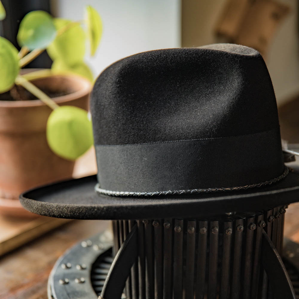 Elegant Fedora, This is a medium height centre dent with a 7 cm / 2.75 in overwelt pencil roll brim. It features a 38 mm modern grosgrain hatband with a double back bow & leather cord.