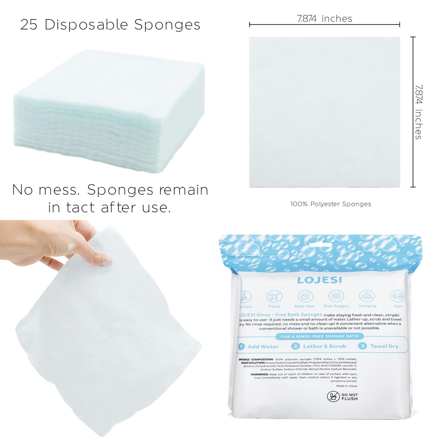 🛁 All-in-One Rinse-Free Bathing Wipes: Disposable Bathing Wipes are your shower alternative anytime, anywhere. Just add water, lather, and towel dry—no rinsing required. Perfect for freshening up when traditional bathing isn’t possible.